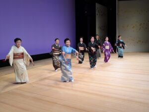 最後に清元 夕顔棚です。私もこの踊りは初めてつき合わさせてもらったのですが、本当に面白い踊りでした。お盆の晩に湯上りの老夫婦が夕顔棚の下でお酒を酌み交わしほろ酔い機嫌で踊ったり、歌ったりの楽しい舞踊でしたが、それにもまして会主の花柳愛知代先生と花柳翔乃愛さんの軽妙な芝居と踊りで会場のお客さんを最後まで抱腹絶倒で湧かせてくれました。